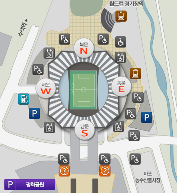상임월드드컵 경기장의 주자장은 서쪽과 동쪽 두 군데에 있습니다~