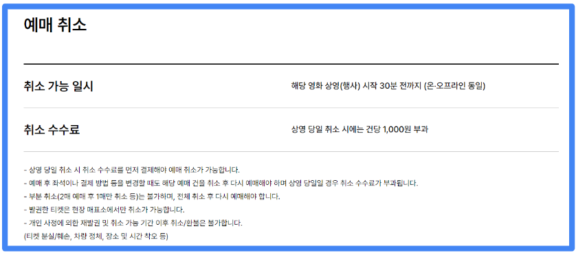 부득이하게 티켓을 취소해야할 경우 해당 상영시간 시작 30분 전까지 가능하며 좌석/ 결제 방법 변경 등을 원할경우도 전체 취소 후 다시 예매해야 합니다. 취소 수수료가 건당 발생하니 신중히 진행하세요!