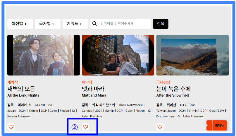 ② 프로그램 섹션-> 상영작 검색-> 아래 하트❤️ 눌러서 관심작품 추가