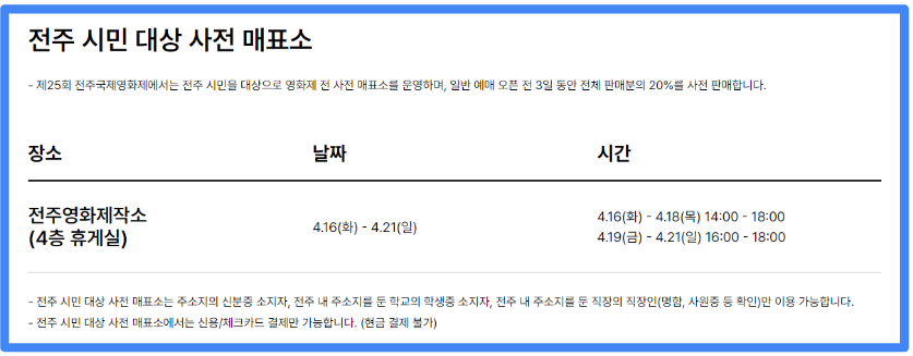 전주국제영화제는 일반 예매 오픈 전 3일동안 전체 판매분의 20%를 전주 시민을 위해 사전 판매합니다. 전주시민임을 인증할 수 있는 신분증 등을 꼭 지참하시고, 기간별 사전 예매 시간이 다르니 메모 꼭 하세요 ^^
