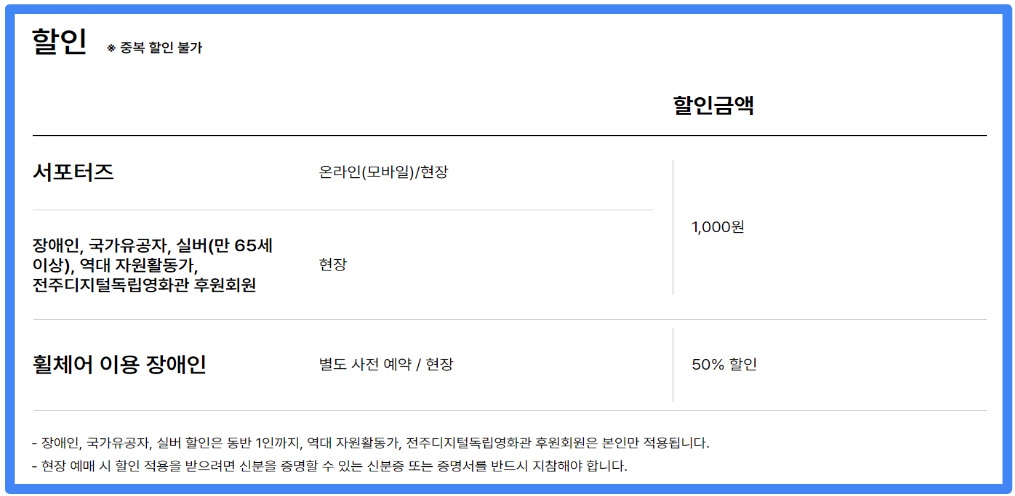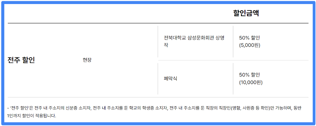- 전주시민 대상 사전예매 및 할인 정보(오프라인만 가능): 3번 섹션에 별도 포스팅 해드리니 확인 해주세요 ^^