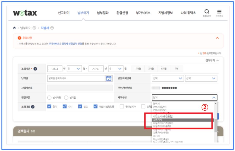 ① 위택스 홈페이지 로그인-> 6월 자동차세 1기분 안내 선택