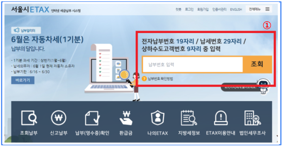 * 비회원일 경우 입력란에 '전자납부번호' 또는 '납세번호' 입력 해서 납부 가능