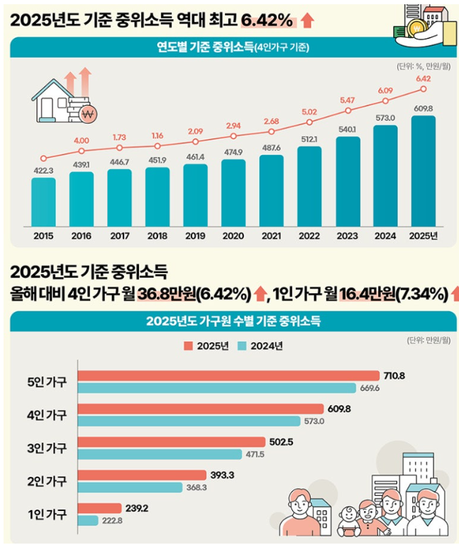 2025년 기준 중위소득은 2024년 대비 6.24% 인상된 금액으로 결정되었습니다. 역대 최대 수준의 인상률이며 이는 물가 수준을 반영한 값입니다. 이렇게 중위소득이 인상된다는 것은 생계, 의료, 주거, 교육급여를 받을 수 있는 수급가구가 많아지며 다양한 정책 지원 대상도 확대된다는 의미 입니다.